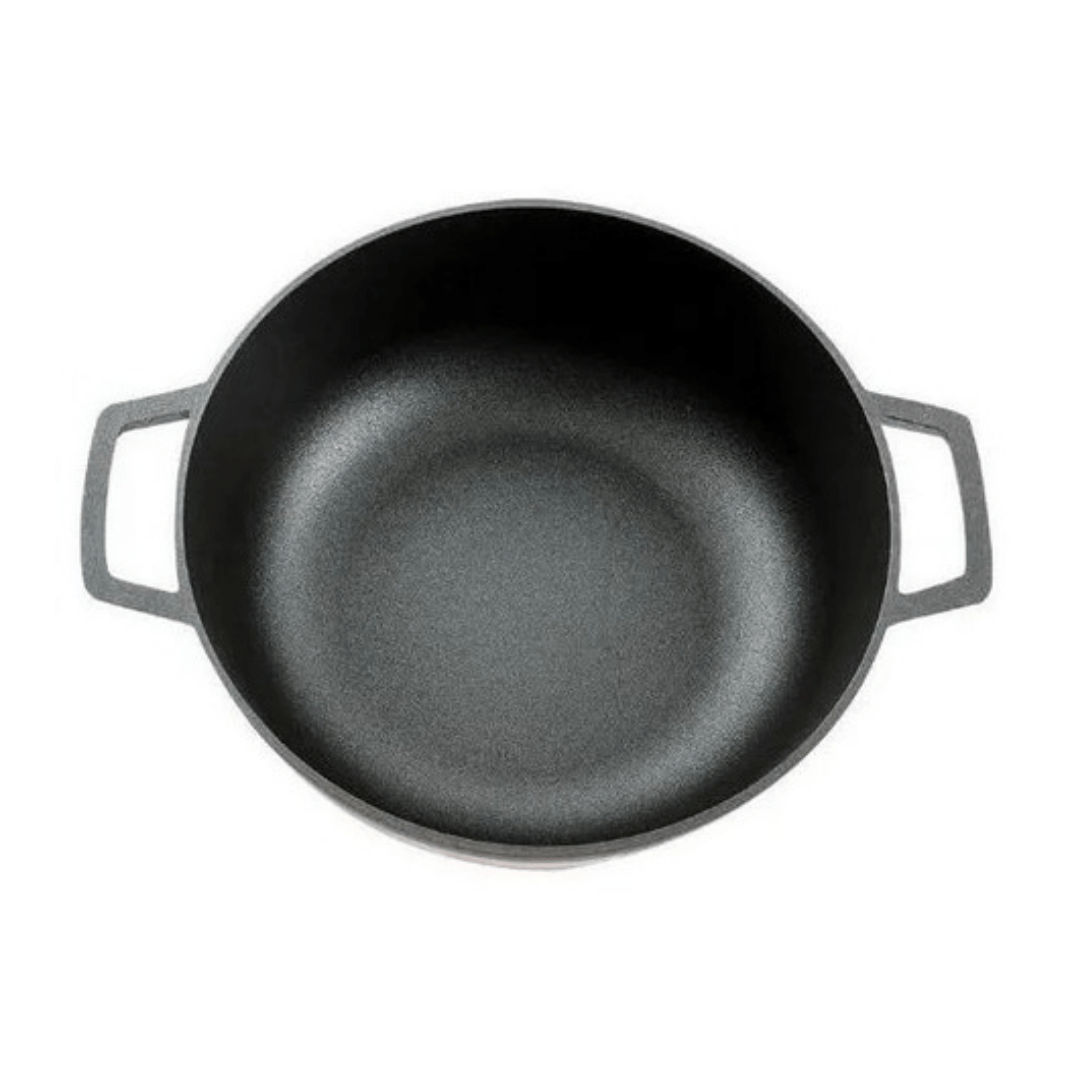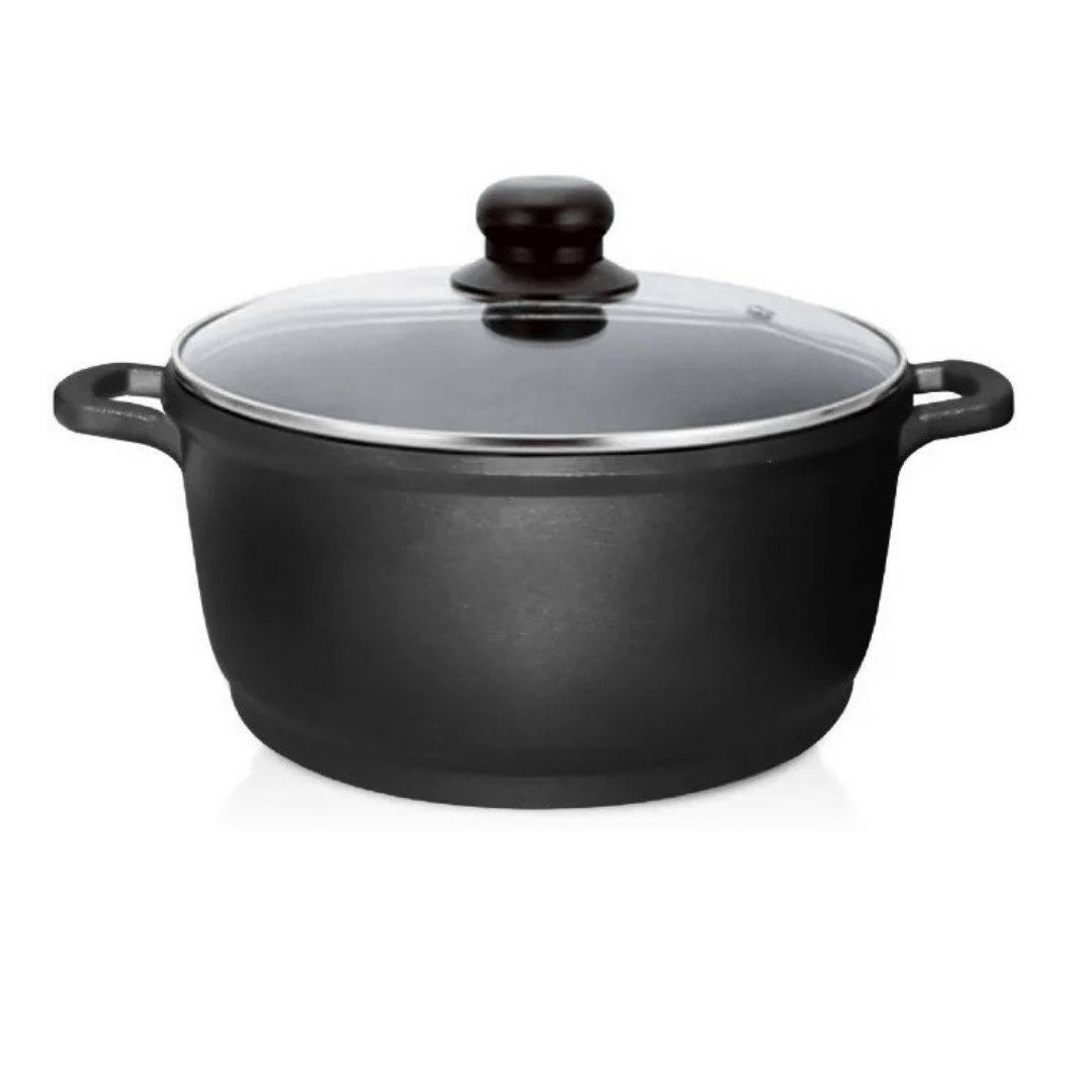 Caldero antiadherente con tapa de vidrío. Caldero Inyectado con 2 asas y valvula de vapor.
